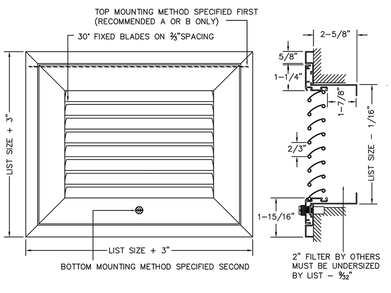 · Horizontal blades fixed on 30 degree deflection and 2/3” spacing