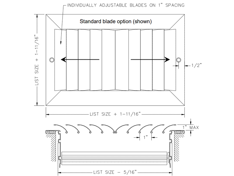 · Two way individually adjustable vertical curved blades on 1” spacing allows a wider spread of air to be achieved
