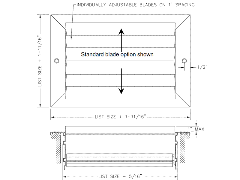 · Two way individually adjustable horizontal curved blades on 1” spacing allows a wider spread of air to be achieved