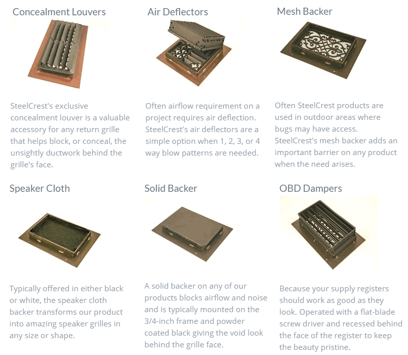 The Bronze Series are the least expensive of the SteelCrest grille lines. Available in Tuscan, Square, and Slotted designs, in most standard sizes, and in four popular finishes. Manufactured from 18 gauge stamped steel. These decorative registers and grilles are easy to install and ready when you need them.